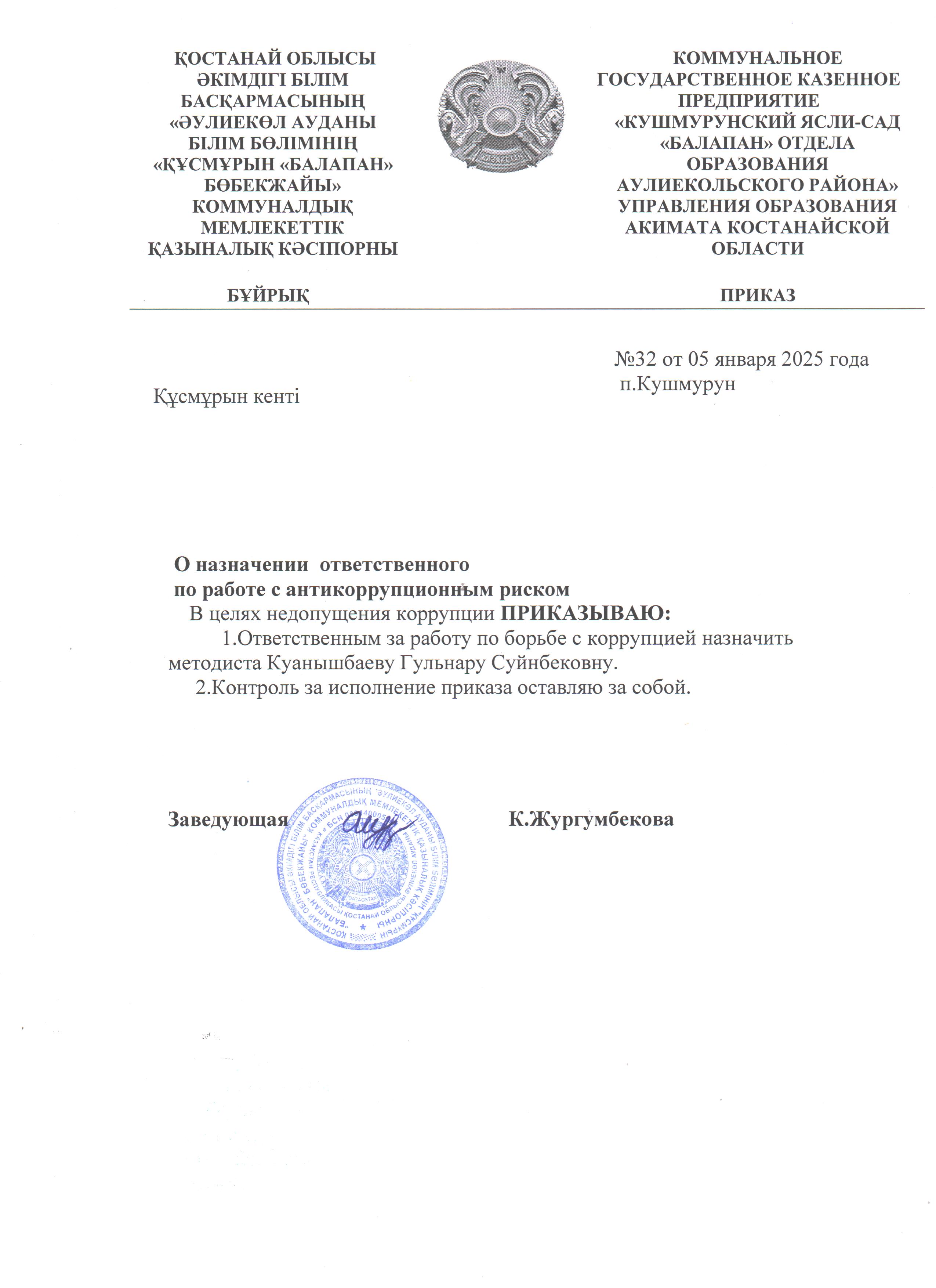 КГКП "Кушмурунский ясли-сад "Балапан" отдела образования Аулиекольского района" Управления образования акимата Костанайской области